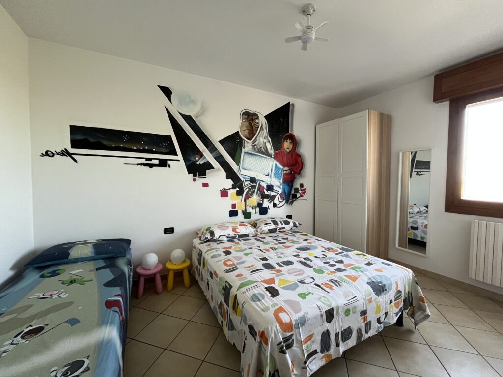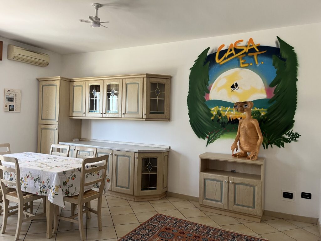 CasaET si trova al piano ammezzato ed è completamente dedicata al film, con una riproduzione in resina del nostro amato extraterrestre. L’appartamento è composto da un soggiorno con angolo cottura e TV, una camera matrimoniale con un letto singolo aggiuntivo, una camera singola, un bagno finestrato. Come ospite di CasaET, avrai il posto auto riservato all’interno della proprietà nonché l’accesso alla lavanderia (munita di lavatrice ed asciugatrice) e al giardinetto privato.